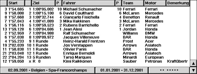 1) Info F1Stats ist wie der Name schon andeuted, ein Statistik- und Auswertungsprogramm für die Formel1. Es lassen sich die Rennen und die jeweiligen Ergebnisse anzeigen. Interessant wird es allerdings erst bei den Statistiken. Über die Filtermöglichkeiten können nahezu beliebige Informationen herausgezogen werden. |